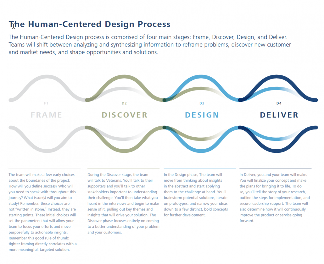 I led a comprehensive effort to understand HCD best practices in the VA, private sector, and public sector with the goal to author VA’s first HCD toolkit. Together with a cross-functional team of designers, design researchers, business analysts, and content strategists, we conducted an environmental analysis of best HCD practices, where I led the analysis of HCD best practices in 7 organizations (IDEO, Deloitte, Frog, Doblin, Fjord, VA, and GSA). After interviewing over 20 industry HCD subject matter experts and HCD leaders, I synthesized and authored insights into VA’s very own brand for a unique HCD framework, case studies, resources.